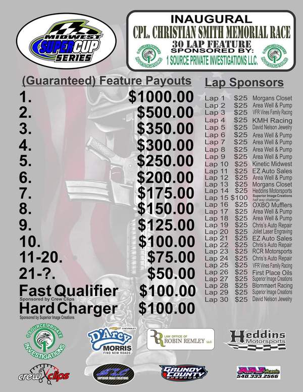 Payout Schedule for May 21st Cpl.Christian Smith Memorial Race