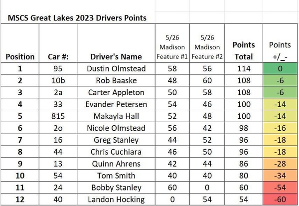 Here is the points for Midwest Super Cup Series Great Lakes after Madison 5/26